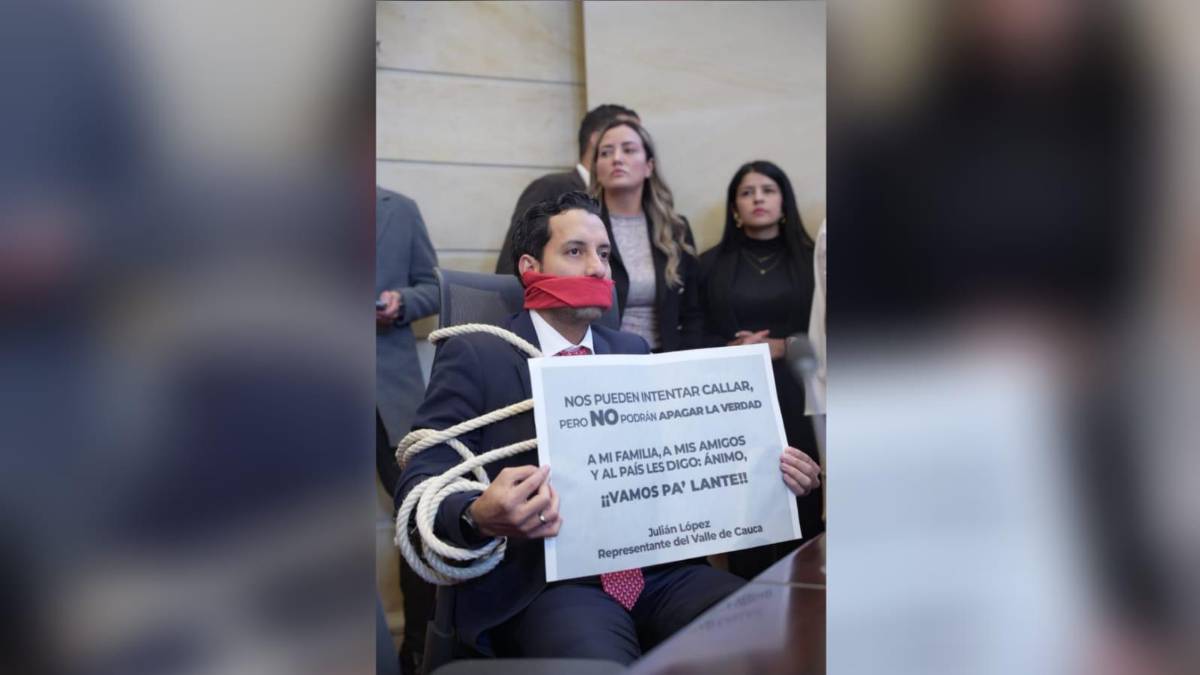 Con una cuerda atada al cuerpo y una tela roja cubriéndole la boca, el presidente de la Cámara de Representantes, Julián López Tenorio, apareció así en la plenaria de este martes en señal de protesta, horas después de que el Partido de la U lo suspendiera de su militancia por tres meses.