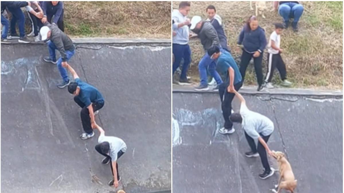 Según las imágenes de videos en redes sociales, la perrita intentaba desesperadamente “sostenerse de una de las paredes de la infraestructura” del canal. Tras varios intentos, el hombre ubicado en la punta de la cadena humana logró sujetarla del collar.