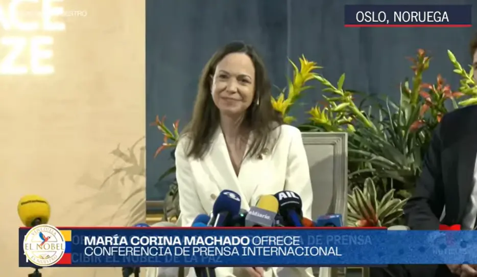 Junto a Jørgen Watne Frydnes, presidente del Comité Nobel, María Corina Machado habló sobre su futuro tras lograr salir de Venezuela. En una rueda de prensa internacional, la líder opositora explicó cuáles serán sus prioridades para su país. También enfatizó la importancia de trabajar por la seguridad y el regreso de la democracia, eliminando así todo régimen que deteriore la separación de poderes y vulnere la Constitución.