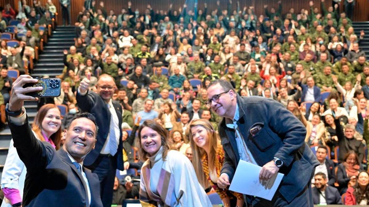El encuentro se realizó este viernes en Bogotá, en el teatro Cafam de La Floresta, y fue encabezado por el ministro de Defensa, general (r) Pedro Sánchez. También asistieron los viceministros Juliana Coronado, de Políticas de Defensa y Seguridad; Luis Edmundo Suárez, de Estrategia y Planeación; y Ana Catalina Cano, de Veteranos y Grupo Social y Empresarial de la Defensa (GSED), al igual que delegados de la Policía, Ejército, Armada y Fuerza Aeroespacial.