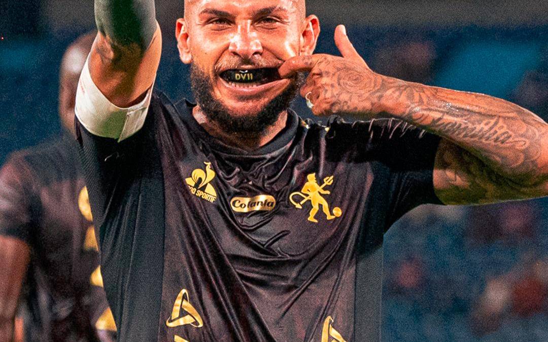 Duván Vergara y el gesto de estar pescando un tiburón durante la celebración de su gol en el Metropolitano. FOTO @AmericadeCali